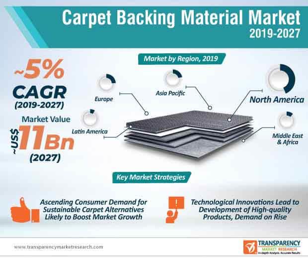 ALBANY, NEW YORK, US, January 11, 2022 /EINPresswire.com / -- In terms of value, the global carpet backing material market is anticipated to expand at a CAGR of ~5% from 2019 to 2027. Carpet backing material is used as a protective coat for carpets. Carpets can be manufactured in two ways: handmade or machine made. Different types of carpets include hand woven, tufted, and needle felt. Woven carpet is made on a loom that is quite alike to a loom for weaving fabric. The production process of tufted carpets varies compared to that of woven carpets.