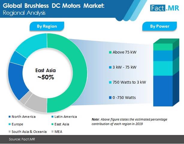 East Asia leads global sales with over 50% share of the total market sales. Surging industrial production, and power generation in countries such as Indonesia, Singapore, and Malaysia is driving the demand for Brushless DC Electric Motors in this region.