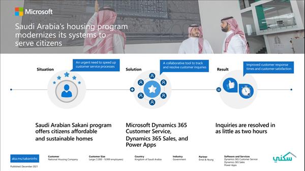 RIYADH, SAUDI ARABIA, January 18, 2022 /EINPresswire.com / -- Through its new CRM platform, The Sakani Program has accelerated its customer service to Saudi citizens on the lists of the Ministry of Municipal and Rural Affairs, Housing and the Real Estate Development Fund, in order to help them become homeowners while enhancing their experience and satisfaction with the services provided to them through the use of Microsoft Dynamics 365.