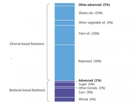 Advanced biofuels still make up a small portion of total EU outputEU biofuel production split by feedstock-%