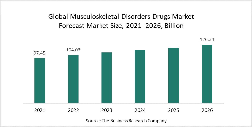 The global musculoskeletal disorders drugs market size is expected to grow from $97.45 billion in 2021 to $104.03 billion in 2022 at a compound annual growth rate (CAGR) of 6.8%. The growth is mainly due to the companies rearranging their operations and recovering from the COVID-19 impact, which had earlier led to restrictive containment measures involving social distancing, remote working, and the closure of commercial activities that resulted in operational challenges. The musculoskeletal disorders drugs market value is expected to reach $126.34 billion in 2026 at a CAGR of 5%.