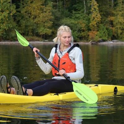 Anna kayaks in her Citrine Yellow Origami Paddler.