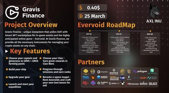 Gravis Finance is a unique gamified ecosystem that unites DeFi with Gmart NFT marketplace for in-game assets and the highly anticipated online game - Evervoid. Gravis Finance's goal is to provide users with a tool for generating basic income in cryptocurrency.