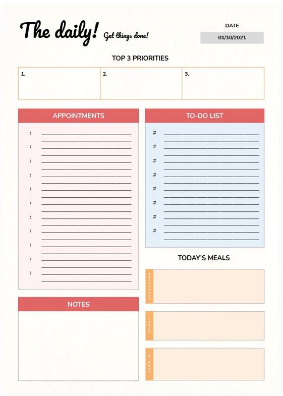 Daily Planner – free Google Docs TemplateIt is a suitable template that is more suitable for women. It's because of the custom design. However, you can use it not only to plan your activities but also to highlight your main successes for the whole day.