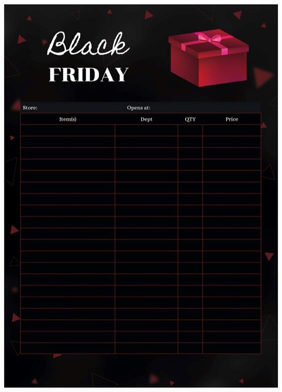 Black Friday Planner – free Google Docs TemplateThis version is made mostly in black color. It is a great option to make a list of products for Black Friday in any store. Also, considering that our designers create templates from scratch, you will get a unique opportunity for free.