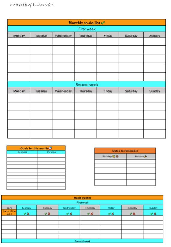 Monthly Online Planner – free Google Docs TemplateIt is a very versatile and easy-to-use template. Using it, you can effortlessly plan not only daily activities. You can set goals for a month in advance, and write down the main tasks for two weeks at once. Moreover, there are additional fields.