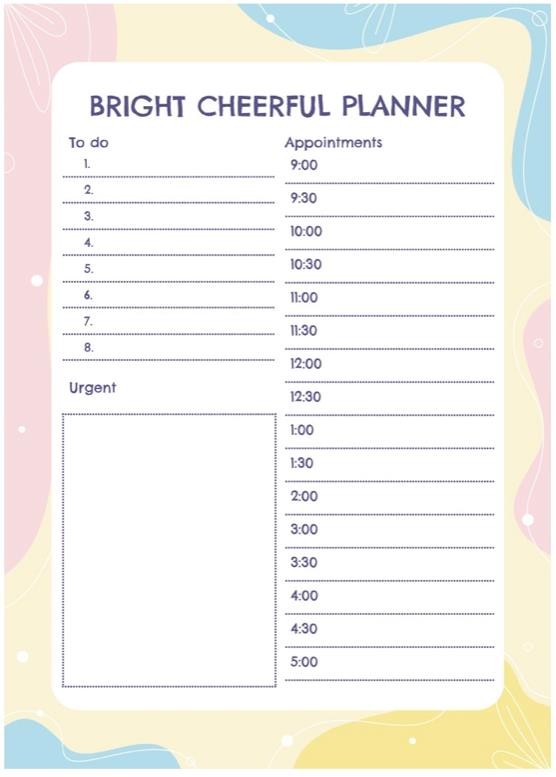 Bright Cheerful Planner – free Google Docs TemplateIt is a bright planner in a minimalist design with all the fields you need for your convenience. You will be able to make basic plans and leave notes for each of the planned actions.