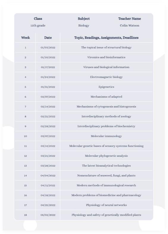 Syllabus Planner – free Google Docs TemplateIf you are a teacher, then there is another convenient template for you. Here you can write down topics for each lesson during the semester, including weeks, dates, and descriptions.