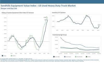 LINCOLN, Neb., April 7, 2022 /PRNewswire/ -- March inventory levels for used heavy-duty trucks were up 10 percentage points from February, according to the latest Sandhills Global Market Report examining heavy-duty truck trends. The month-to-month inventory increase was the largest in the used truck market since Q3 2018, a point in time where inventory levels began steadily increasing after a protracted 13-month decline. Trucks in the 0- to 5-year (up 17.2% M/M) and 5- to 10-year (up 7.7% M/M) age groups were the primary drivers of change, signaling that new truck production and fulfilled orders may be impacting the used truck market. Inventory levels in the construction and farm equipment markets were down across most age groups.