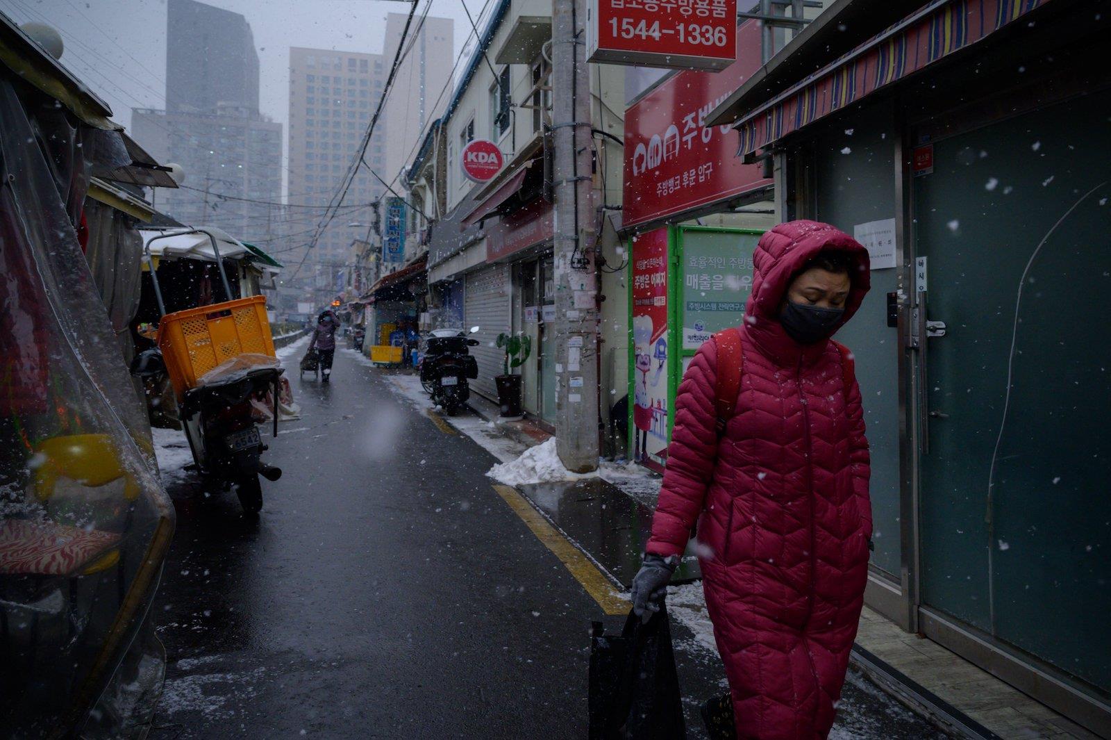 A shopper walks along the alleyway of a market in Seoul on January 12, 2021. Photo: AFP / Ed Jones
