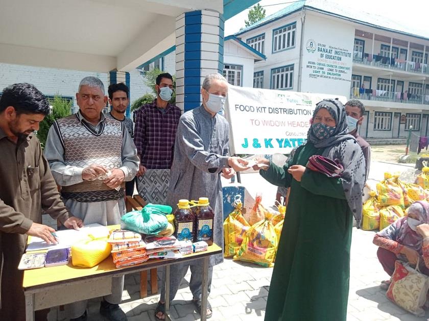Srinagar- The Jammu and Kashmir Yateem Trust on Sunday distributed food kits and Eidee @ 1000 per family among 300 registered widow headed families at its suboffice Gopalpora Chadura.