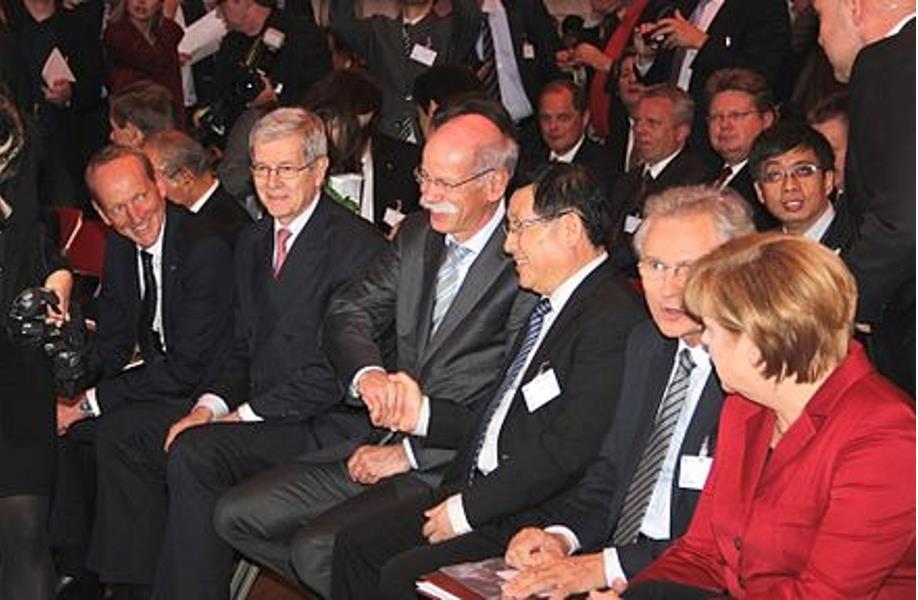 Wan Gang (C) is seen shaking hands with Dieter Zetsche, then-head of Mercedes-Benz, with then-German Chancellor Angela Merkel looking on. Image: Supplied