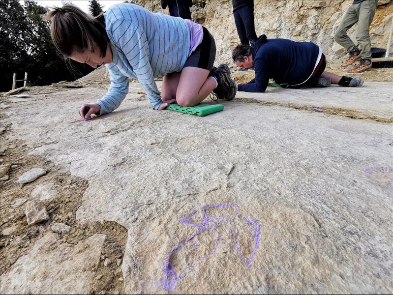 Ichnologists examining an area with trace fossils - a way to reconstruct ancient life even in the absence of body fossils. Jurassica Museum