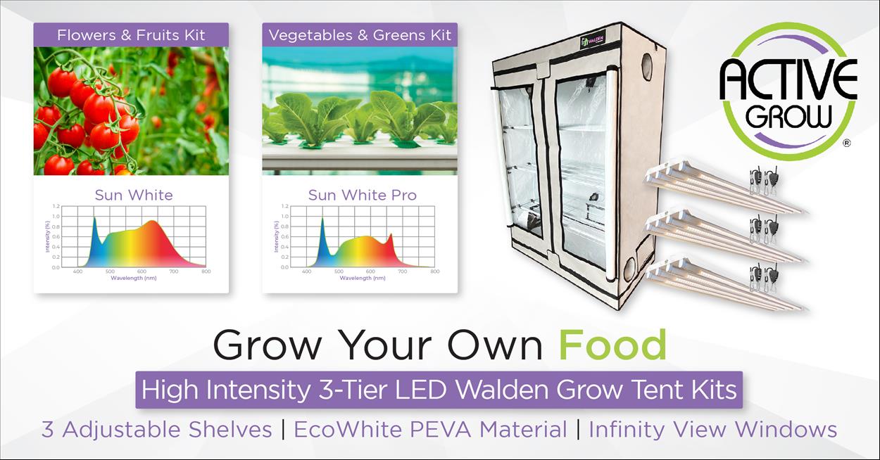 Our goal with the Walden LED Grow Tent Kits is to give our customers the tools they need to become self-sufficient and grow their own food and medicine” — Taylor Schaberg, CEO of Active GrowSEATTLE, WASHINGTON, USA, June 6, 2022 /EINPresswire.com / -- Active Grow, the sustainable horticultural lighting manufacturer, is proud to announce the launch of two new 3-Tier LED Walden Grow Tent Kits: The Flowers and Fruits High Intensity Kit and The Vegetables and Greens High Intensity Kit . These innovative and easy-to-use systems allow growers of all experience levels to grow high-light requirement plants at home with professional results.'Our goal with the Walden LED Grow Tent Kits is to give our customers the tools they need to become self-sufficient and grow their own food and medicine,” says Taylor Schaberg, CEO of Active Grow. With the addition of these two kits, Active Grow now carries a complete line of LED grow tent kits designed for all major plant groups including flowers and fruits, vegetables and greens, seed starting, microgreens and even mushrooms.“There is no one size fits all light spectrum for every type of plant. That's why we work directly with experts in their specific fields to develop dedicated lighting and grow tent products for growers that want to grow anything successfully,” says Schaberg.