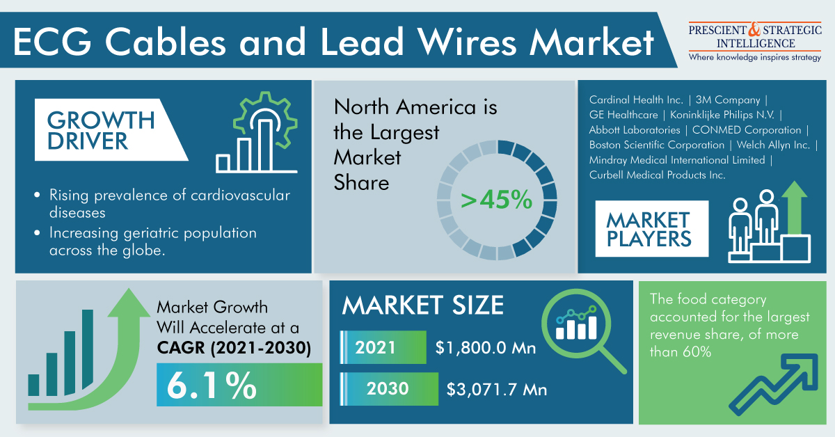 (MENAFN- P&S Intelligence) The major drivers in the global ECG cables and lead wires market are rising geriatric population levels and increased incidence of cardiovascular diseases. In 2021, product sales valued $1,800.0 million, and it is predicted to reach $3,071.7 million by 2030. Furthermore, the market will grow at a 6.1% CAGR in the coming years. Moreover, the rising prevalence of hyper-anxiety or insomnia among the patients will also propel growth in the market. This is because the number of ECG tests done will go hand in hand with the rising number of patients.