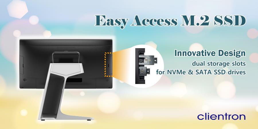 Clientron's innovative mechanical design Easy Access M.2 SSD with dual storage slots for NVMe and SATA SSD drives makes it easy to utilize your POS storage.” — Clientron Corp.NEW TAIPEI CITY, TAIWAN, July 14, 2022 /EINPresswire.com / -- As technology evolves, storage is getting slimmer and capacity is rapidly increasing. Storage is one of the key elements of a POS system, and customers always demand higher capacity and smaller size while retaining the flexibility to expand storage in the future. Clientron's innovative mechanical design Easy Access M.2 SSD with dual storage slots for NVMe and SATA SSD drives makes it easy to utilize your storage.The Easy Access M.2 SSD design allows you to replace the M.2 SSD drive without disassembling the entire POS terminal; therefore, users can easily upgrade or replace the drive themselves. M.2 is the term that describes the form factor, so you can get M.2 drives that use either SATA or NVMe connection protocols. The Easy Access M.2 SSD is compatible with SATA and NVMe, possibly covering all SSD connection standards, and you can also move the screw in the middle of the tray to install a 2242 or 2280 size SSD drive in the POS terminal.