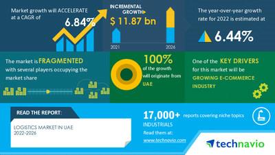 NEW YORK, July 22, 2022 /PRNewswire/ -- The logistics market in UAE is fragmented. Vendors are deploying growth strategies such as focusing on distinguishing their solutions and service offerings through a clear and unique value proposition to compete in the market. The market size is expected to grow by USD 11.87 billion from 2021 to 2026. In addition, the growth momentum of the market will accelerate at a CAGR of 6.84% during the forecast period.