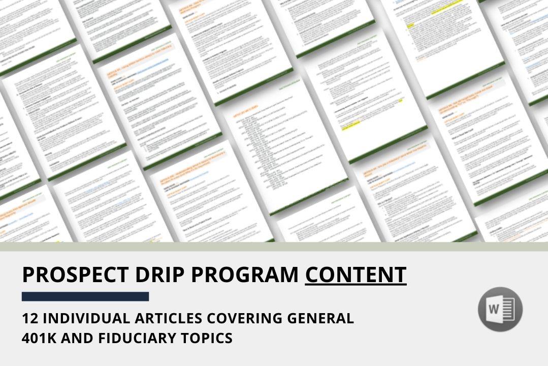 The Prospect Drip Content complete kit is part of the 401(k) Business in a Box document library for 401(k) advisors. Individual kits can be purchased a la cart to accomplish a specific goal, or advisors can subscribe as a 401(k) Quarterback and access the full library.