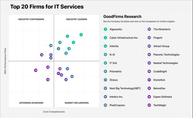 This list of Top 20 IT Service Companies are acknowledged via GoodFirms' Leaders Matrix methodology for offering innovative IT solutions.” — GoodFirmsWASHINGTON, WASHINGTON, UNITED STATES, July 29, 2022 /EINPresswire.com / -- Globally recognized research, ratings, and review platform GoodFirms recently released the winners of the 2022 list of top Firms for IT Services worldwide under its leaders' matrix analysis.'Providing world-class IT services across all industries is more important than ever. These winning companies have been delivering standout IT solutions which improve business growth regardless of the industry. We look forward to seeing their sustained innovation across IT services, driving successes for their companies and clients,” says GoodFirms..