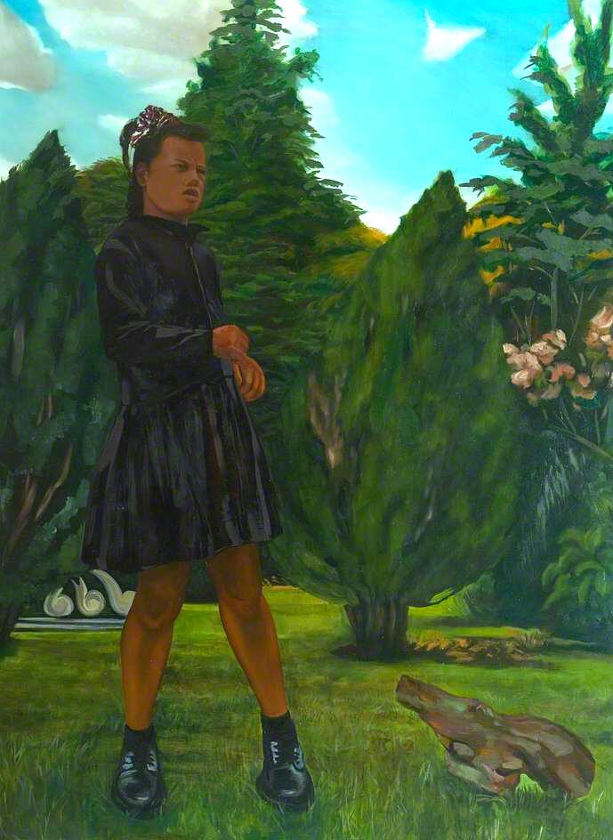 His subjects were primarily his daughters and younger brother portrayed against luscious landscapes and brooding skies. Paintings such as Lulu Holding Stalks of Wheat (1993) and The Brother (1992) are imbued with a deeply personal dimension. Others such as The Letter (1992), depicts a man in smart 1950s attire, or the curiously titled Duppy Shadow (1993). Originating from African folklore,“duppy” is a term for a ghost, which is commonly used in Jamaica, illustrating how Palmer draws on aspects of his Jamaican heritage.