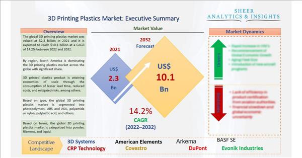 MILWAUKEE, WISCONSIN, UNITED STATES, August 15, 2022 /EINPresswire.com / -- According to a market report, published by Sheer Analytics and Insights, the total market was valued at $2.3 billion in 2021 and it is expected to reach $10.1 billion at a CAGR of 14.2% between 2022 and 2032.The demand for the 3D printed plastics market is increasing in several end-user industries such as automotive manufacturing, healthcare sectors, military, and defense, as well as in consumer goods and services. This huge demand is driving the growth of the 3D printing plastics market . Moreover, there are several benefits such as flexible design, rapid prototyping, high durability, strong and lightweight parts, fast design and production, rigidity, and outstanding ultraviolet and temperature obstructive capability that are significantly propelling the demand for the 3D printing plastics market in these global industries.