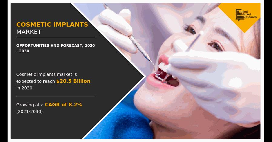 PORTLAND, OREGON, UNITED STATES, August 22, 2022 /EINPresswire.com / -- According to a new report published by Allied Market Research, titled,“Cosmetic Implants Market ,' The cosmetic implants market size was valued at $9,240.80 million in 2020, and is estimated to reach $20.5 Billion by 2030, growing at a CAGR of 8.2% from 2021 to 2030. Cosmetic implant is embedded implant used to improve the aesthetic beauty of an individual. Either Invasive or non-invasive surgical procedures are used to embed the cosmetic implants in body of an individual. People can now easily replace damaged or missing body parts, regain their natural look, and enhance their aesthetic appearance, owing to cosmetic implants.