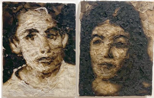 Roughly 30 years following her visit, she created bas-relief portraits of the victims layered with“burnt or singed calico and thin cotton material with the texture of bandages” through a practice she termed the“Ruins Technique”,“where the creative process begins with an act of destruction”.