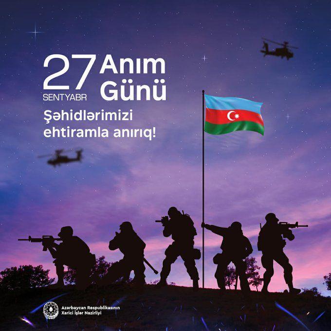 'September 27 - on Remembrance Day, we honor with deep respect and pride the blessed memory of our martyrs, who died for the independence, sovereignty, and territorial integrity of Azerbaijan,' the ministry also on its Twitter account.