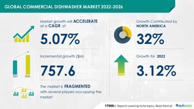 NEW YORK, Oct. 3, 2022 /PRNewswire/ -- The is expected to grow by USD 757.6 mn during 2021-2026, at a CAGR of 5.07% during the forecast period. The market is driven by product innovation in terms of technology, performance, features, design, and capacity of loading. In addition, the Increasing demand for equipment with improved displays is anticipated to boost the growth of the Commercial Dishwasher Market.