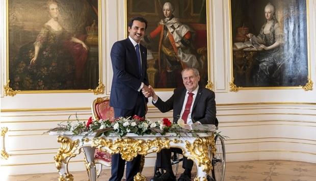 His Highness the Amir Sheikh Tamim bin Hamad al-Thani and President of the Czech Republic Milos Zeman held Wednesday an official talks session at the presidential residence in Prague Castle in the Czech Republic.