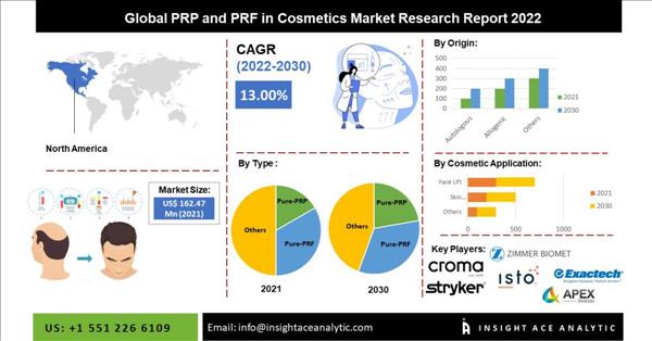 Prominent Players in the PRP and PRF in Cosmetics Market: Stryker Corporation, Croma-Pharma GmbH, Zimmer Biomet, Isto Biologics, Exactech, Inc., EmCyte Corporation, Regen Lab, APEX Biologix” — Insightace AnalyticNEW JERSEY, USA, October 6, 2022 / / -- InsightAce Analytic Pvt. Ltd. announces the release of a market assessment report on the ' By Type (Pure-PRP, Leukocyte-rich PRP and Pure-PRF), Origin (Autologous, Allogeneic, Homologous and Others), Cosmetic Application (Skin Rejuvenation, Face Lift, Hair Application, Plastic Surgery, Scar-related Treatment and Others)- Trends, Industry Competition Analysis, Revenue and Forecast To 2030.'