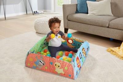 7-in-1 Senses & Stages Developmental Gym™: Make every day a gym day with the 7-in-1 Senses & Stages Developmental Gym™. We've got your little one covered from tummy time to ball-pit play with activities to help build their muscles, minds, and senses. Built-in features are designed to nurture each developmental stage from birth to toddler, and the included guide explains just how to use each play zone and accessory to support your baby's growth. Encourage little ones to explore the sights, sounds and textures of the mat, musical xylophone, and sensory toys. Create a soft, enclosed play space by folding up the sides of the mat. Add 20 balls to create a playful ball pit! When it's time to clean up, store all the balls in the cute sloth bag. This newborn-to-toddler gym includes a fabric mat, overhead arches, a removable xylophone with stand, a tummy-time pillow, six sensory toys, six links, four image cards, 20 balls, a storage bag and a developmental guide. Mat and pillow are machine washable. (Ages birth +; MSRP $79.99)