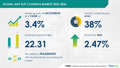 NEW YORK, Oct. 11, 2022 /PRNewswire/ -- The is expected poised to grow by USD 22.31 million during 2021-2026, at a CAGR of 3.4% during the forecast period, according to Technavio. The growing demand for anti-slip coatings in APAC, growth in the global construction industry, and growing emphasis on reducing accidents due to slipping will offer immense growth opportunities.