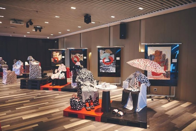 Art installation featuring the key pieces from the collection inspired by artists Yayoi Kusama and Jean Michael Basquiat along with a few paintings and photography by designer Didier Lecoant