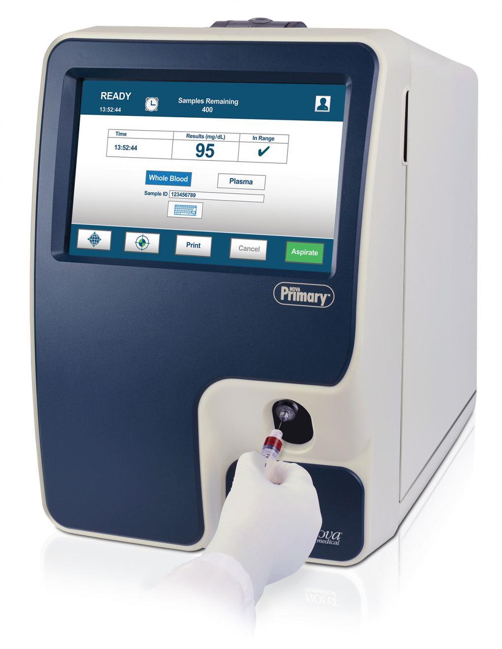 Like the YSI 2300, Nova Primary uses a single, reusable glucose electrochemical sensor based on glucose oxidase and has a measurement range of 20-900 mg/dL. It uses a small, 25 microliter venous whole blood or plasma sample which is internally diluted as in the YSI. Results are available in approximately 2 minutes. Nova Primary's large color touchscreen display and intuitive, icon-based graphical user interface make it very straightforward to use. A single calibrator pack uses RFID data management to monitor the pack expiration date and number of samples remaining, eliminating the need for separate reagent bottles and daily monitoring of their levels. In clinical laboratory studies using venous whole blood and plasma, the Nova Primary demonstrated excellent correlation to the YSI 2300 and is traceable to NIST glucose standards. The Nova Primary uses a comma delimited (.csv) format data output that can be downloaded via the integral USB data port. The analyzer measures 17 in x 11 in x 18 in (44 cm x 28 cm x 46 cm).