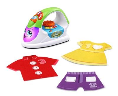 ironing time learning set™ : Press into learning about shapes, colors and counting with the motion-activated Ironing Time Learning Set™! This interactive iron plays songs, silly phrases and sound effects when kids move the iron back and forth. Join the iron in 10+ learning activities! Count to five or sing along to the alphabet song as you iron the included play clothes. Turn the temperature dial to hear about colors, fabrics, and low, medium and high heat. The number one is for low heat, perfect for delicate clothes. Now turn up the heat to watch the light change colors and play steam sound effects! Three buttons show kids numbers, colors and shapes. Press them to hear interactive phrases and questions. Can you find the red shirt? Now iron something with three circles! Watch the iron light up with the color that it names to help kids learn color vocabulary. Hello, yellow! (Ages 18+ months; MSRP: $14.99)
