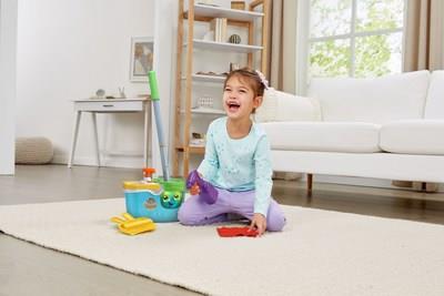 clean sweep learning caddy™ : Mop, hop, spin and sweep with the Clean Sweep Learning Caddy™! Let kids clean up 'messes' while they're still excited to use a broom — your future self will thank you! Your today self (and your child) will love how the cute lil' face on the bucket lights up and sings as kids pretend to clean. The interactive caddy brings learning into clean-up time with imagination. Uh, oh! Muddy paw prints on the floor. Grab the green mop to clean it! The soap pump makes funny squirting sounds as you pump out the imaginary soap. One, two, three. Now press the pedal to see the mop spinnity-spin! Show kids that cleaning actually can be all fun and games with boogie-down dance breaks. Follow fun directions like, 'Hop while you mop! Now dance to the left and dance to the right!' (Ages 3+ years; MSRP: $29.99)