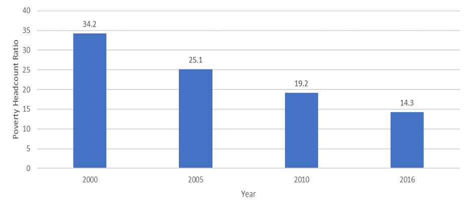 As a result, the country's poverty rate was significantly reduced, falling from 43.5% in 1991 to 14.3% in 2016, based on the international poverty line of US$1.90 per day at the 2011 PPP (purchasing power parity) exchange rate.