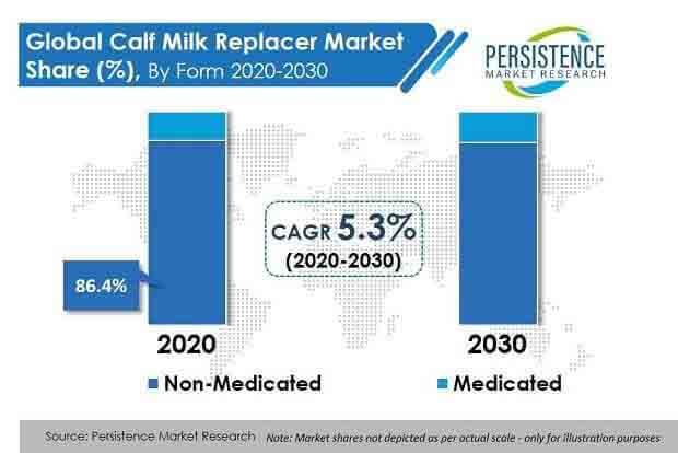 Persistence Market Research, in its new report, offers an impartial analysis of the global calf milk replacer market, presenting historical data ( 2015 – 2019 ) and estimation statistics for the period of 2020 – 2030 . The study offers compelling insights on the calf milk replacer market based on type (medicated and non-medicated) source (dairy-based and non-dairy based), and form (powder and liquid), across seven regions.