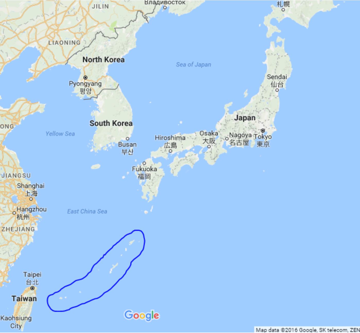 The Nansei/Ryukyu Islands circled on a Google-generated map. Source: Google