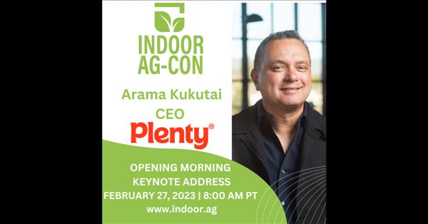 Plenty CEO Arama Kukutai will lead the opening morning keynote address for Indoor Ag-Con, February 27-28, 2023 at Caesars Forum , Las Vegas, Nevada