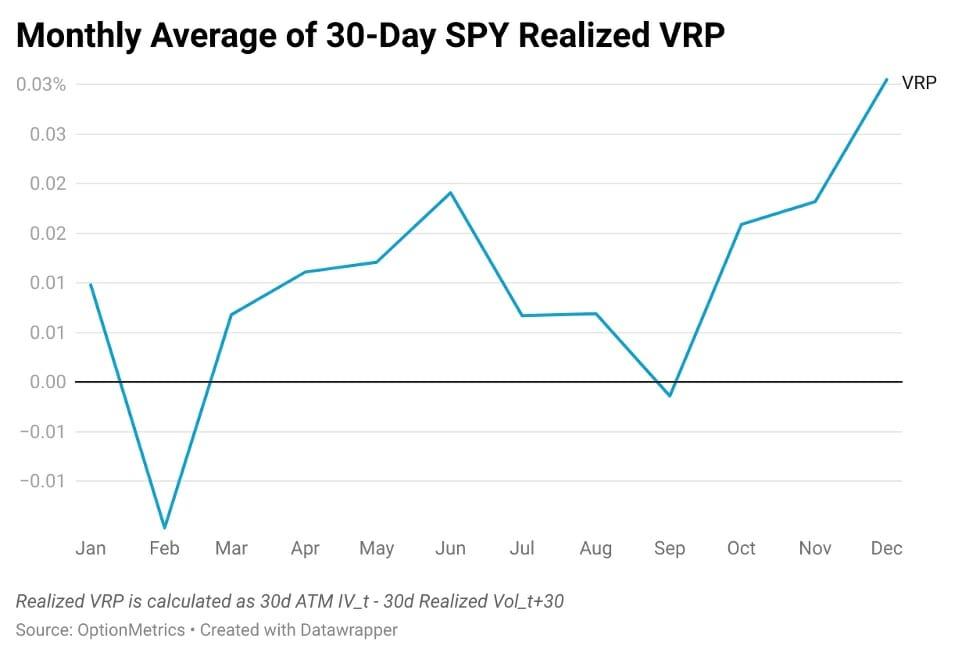 A plausible explanation for a high realized VRP in December is that as investors hedge end of year volatility risk, market-makers increase premiums as a result of option demand, resulting in a high VRP. Investors may be able to potentially capitalize on this phenomenon by utilizing option strategies that sell volatility, such as straddles, in December.
