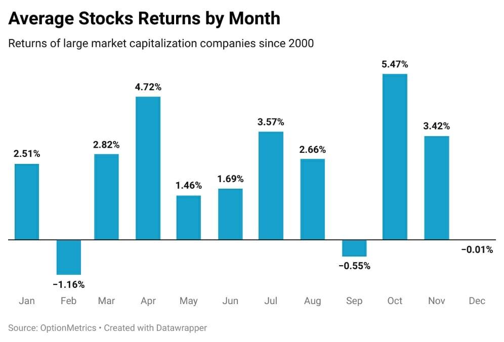 One of the main phenomena is the December effect (Santa Claus rally), where researchers believe the stock market tends to perform better in December than any other month of the year. Potential explanations include investor optimism fueled by holiday spirit, increased holiday shopping, or institutional investors going on vacation, leaving the market to retail investors who tend to be more bullish.