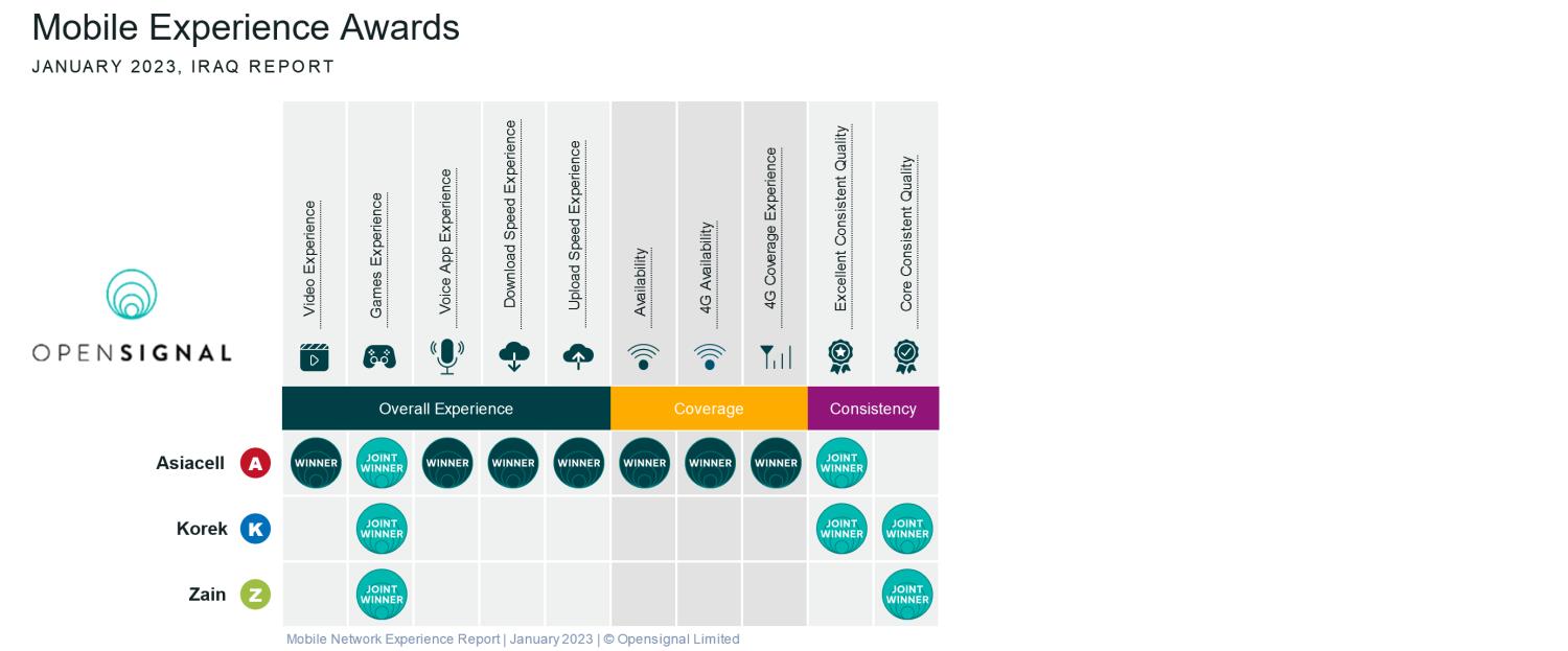 Once again, Asiacell dominates the Iraqi mobile network experience. This time it wins seven out of 10 awards outright and shares the Excellent Consistent Quality award with Korek. Asiacell is also a joint winner for Games Experience alongside Korek and Zain. Korek and Zain do not win any awards outright, instead jointly winning three and two awards, respectively.