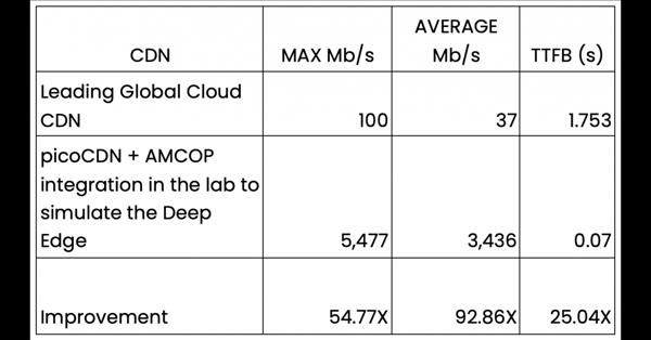 In lab testing to simulate the Deep Edge, a leading Global Cloud CDN achieved 100 Max Mb/s, 37 Average Mb/s, and 1.752 TTFB (Time to First Byte, measured in Milliseconds), while the picoCDN + AMCOP integration achieved 5,477 Max Mb/s, 3,436 Average Mb/s, and 0.07 TTFB, resulting in 92.86x faster data speeds and a 25x better TTFB.