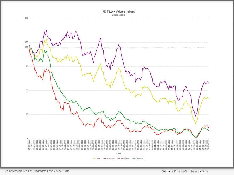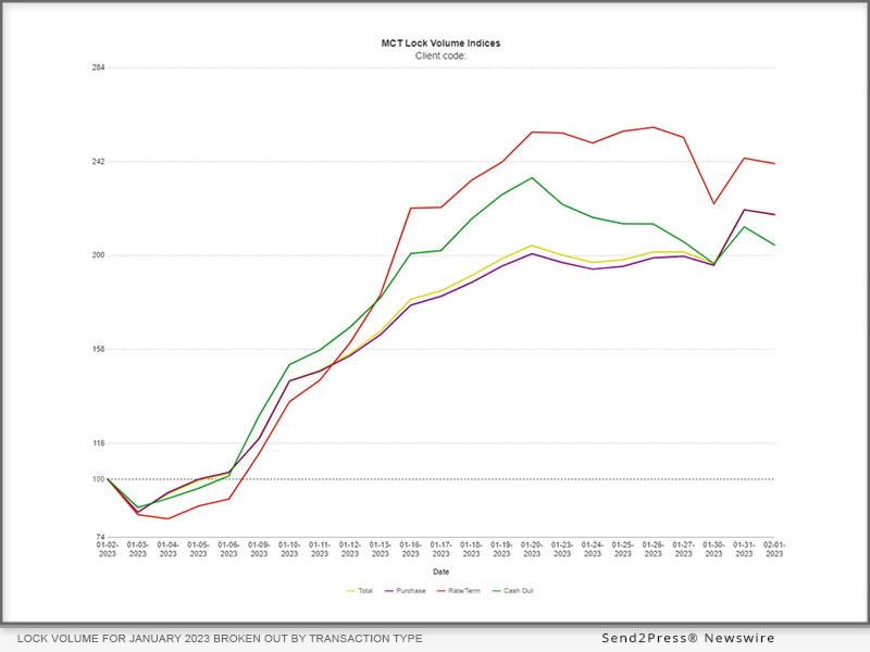 (MENAFN- Send2Press Newswire) SAN DIEGO, Calif., Feb. 3, 2023 (SEND2PRESS NEWSWIRE) - mortgage capital trading, inc. ( mct®) , the leader in capital markets software and services supporting more lenders with hedging and pipeline management solutions than any other single provider, is pleased to present the MCTlive! Lock Volume Indices for January 2023. MCT Data represents a balanced cross section of several hundred lenders among retail, correspondent, wholesale, and consumer direct channels. A broad-based view of the entire market provides a more accurate picture of mortgage originations versus indices that are influenced by mega lenders. The January MCTlive! Lock Volume Indices is broken out by transaction type: purchase, rate/term refinance, and cash out refinance.