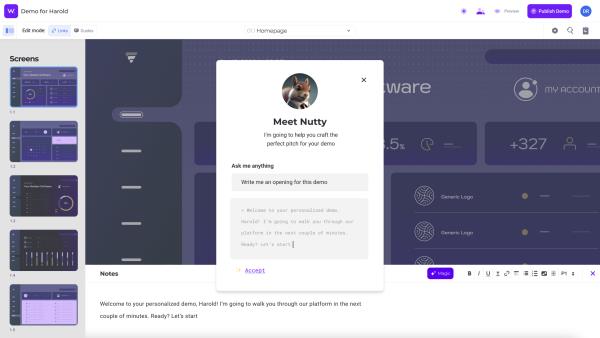 This AI tool is deeply integrated into several of Walnut's key features and helps enhance the way teams prepare and present their product during a sales call. It offers support in editing presenter notes, crafting a comprehensive script based on the demo guide, and addressing any questions or inquiries. Its primary objective is to elevate live sales demonstrations, reduce the time reps spend preparing demo scripts, furnish helpful information in real time, and speed up demo storytelling with the help of ChatGPT.