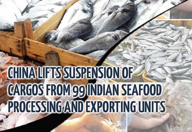 China lifts suspension of cargos from 99 Indian seafood processing and exporting units New Delhi, Feb 17 (KNN) The Marine Products Export Development Authority (MPEDA) informed on Thursday that China has withdrawn the suspension it imposed on shipments from 99 Indian seafood processing and exporting units.