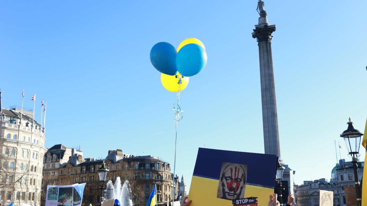 Balloons representing the Ukrainian flag are pictured during a London rally on February 22, 2022, to oppose Russia's attack on Ukraine. China has an argument with countries such as the UK that have taken sides with Ukraine. Photo: Asia Times / Jeff Pao