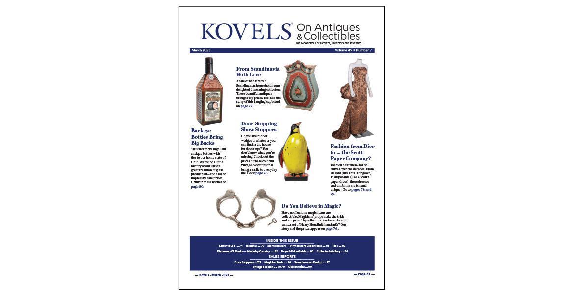 Kovels' March 2023 newsletter features doorstops, magicians' props, Scandinavian design, vintage fashions, and Ohio bottles, all with photos and prices.